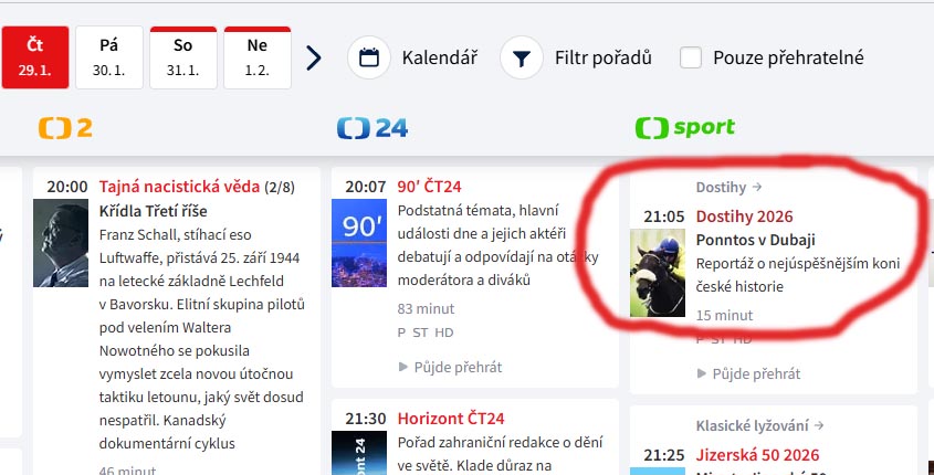Ve čtvrtek 29. ledna ve 21.05 poběží na ČT Sport reportáž z dalšího úspěšného vystoupení trojnásobného Koně roku Ponntose v Dubaji. Pořad, který vznikl ve spolupráci s Jockey Clubem ČR, bude ještě reprízován v pátek 30.1. a středu 4.2.2026.