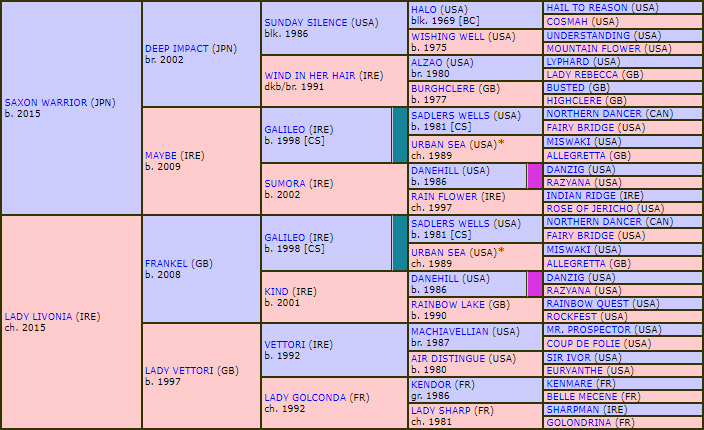 První Saxon Warriorův vítěz je zajímavý i z pohledu svého rodokmenu, v němž najdeme dva jedince z aktuálně nejpopulárnějšího nicku na světě spojení Galileo x Danehill. Jeho největším ambasadorem je neporažený Frankel, mezi klisnami patřila k nejúspěšnějším zástupcům tohoto spojení šampiónka dvouletých klisen Maybe a právě tito dva jedinci tvoří základ rodokmenu Ser Sed. Maybe je matkou Saxon Warriora, taktéž šampióna dvouletých a také vítěze 2000 Guineas, Frankel je vítězovým mateřským otcem. Ser Sed je tudíž 3x3 prochován na Galilea a 4x4 na Danehilla.