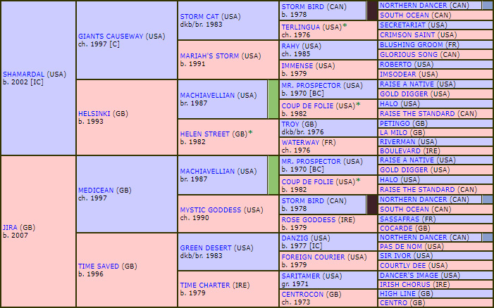 U spojení Shamardal x Machiavellian bychom navíc neměli zapomenout na další důležitý aspekt, kterým je Machiavellianova matka Coup de Folie, jež je 3x3 prochována na Almahmoud, bábu Northern Dancera a její matka Raise the Standard je dokonce Northern Dancerovou polosestrou. Díky vlivu Northern Dancera v dalších částech pedigree je tak Jir Sun (ale nejen on) v pozadí pedigree významně prochován na tuto rodinu, což též pomáhá dobré návaznosti jeho rodičů.