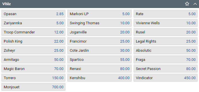 Naopak po víkendu výrazně ztratil Zoheyr (Born to Sea), jehož kurz z původních 10:1 stoupl nyní již na 25:1 a stejným kurzem je hodnocen i další zklamavší z Velké červnové Francimor (Free Eagle). Ještě vyšší kurz má nyní Cote Jardin (Prince Gibraltar), který Velkou červnovou odvodil. (miv)