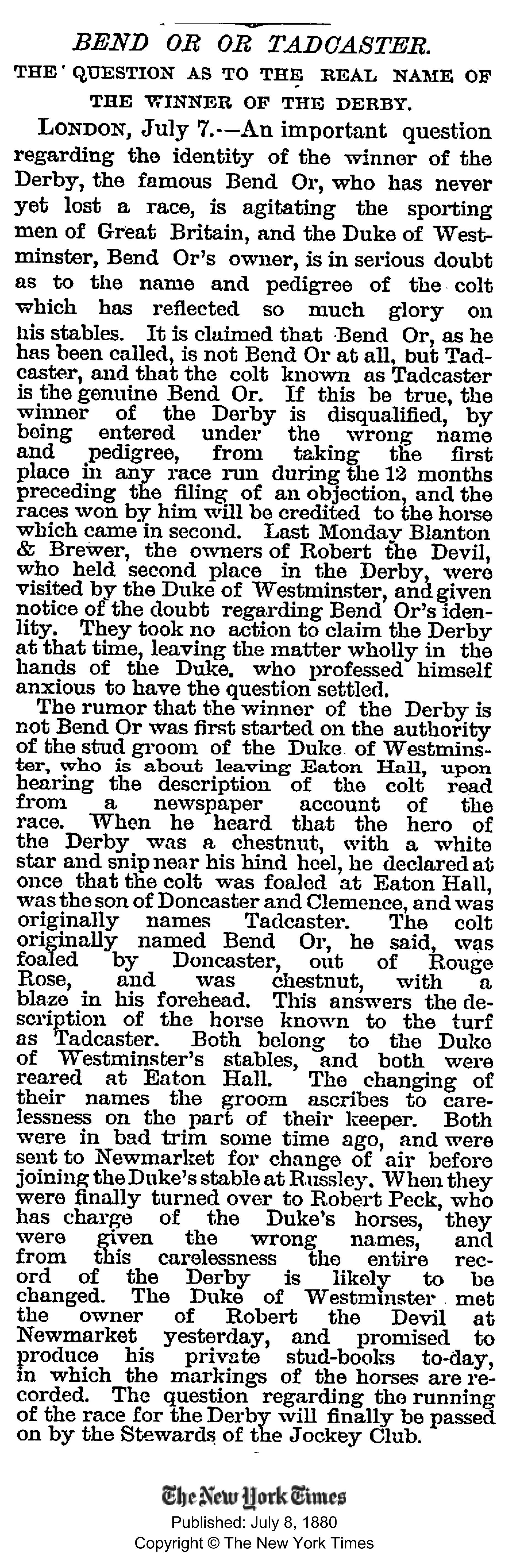 Morris se ve své stati vrací do konce 19. století, přesně do června 1880, kdy v Epsomu v derby triumfoval vynikající Bend Or, syn Doncastera a klisny Rouge Rose (Thormanby). Kůň, který později proslul jako vynikající plemeník, otec nejlepšího koně 19. století Ormonde a pokračovatel linie, k níž dnes patří minimálně 90% všech plnokrevníků na světě, tehdy v barvách svého majitele i chovatele vévody z Westminsteru, připravovaný Robertem Peckem a vedený neméně legendárním Fredem Archerem, splnil roli favorita a porazil Roberta The Devila. Ovšem krátce po jeho vítězství se ozval bývalý ošetřovatel ze stájí vévody z Westminsteru Richard Arnull, který podle popisu vítěze v tisku uvedl, že dostih nevyhrál Bend Or, ale jiný vévodův odchovanec Tadcaster, též potomek Doncastera, ovšem z matky Clemence po Newminster. S tím, že koně byli zřejmě zaměněni, když opouštěli stáje vévody a šli do tréninku.